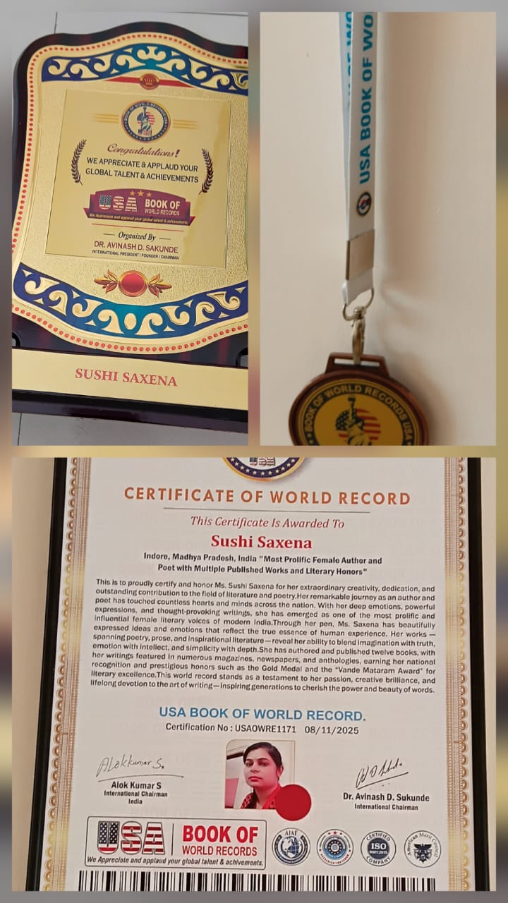 बुक ऑफ वर्ल्ड रिकॉर्ड यूएसए द्वारा लेखिका एवं कवियत्री सुशी सक्सेना सम्मानित